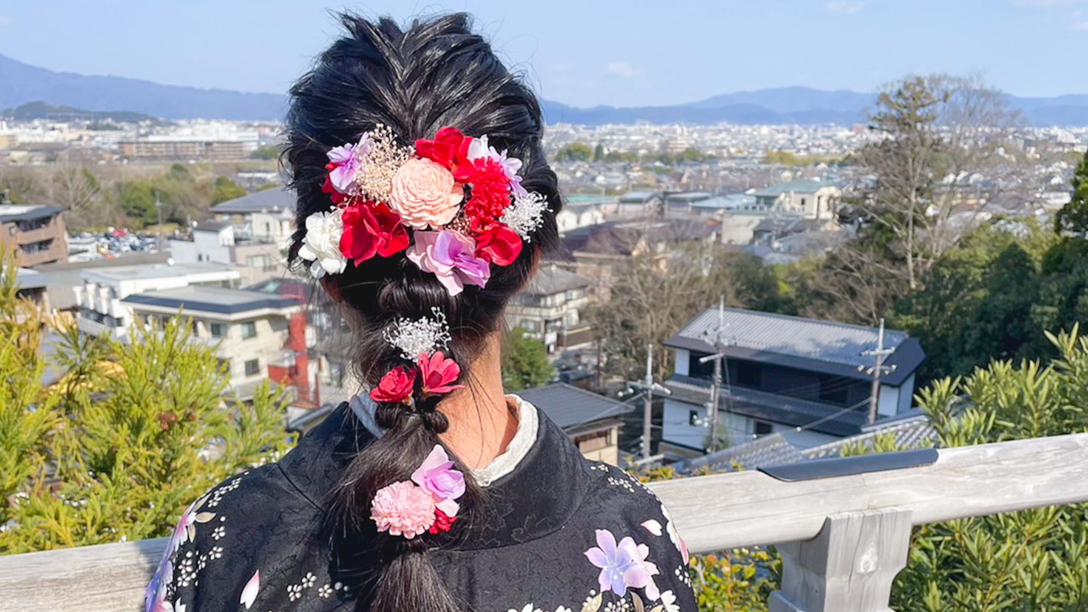 和装の柄にも色が多く入っていたため、髪飾りは“色の統一感”を意識。