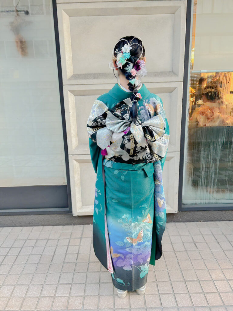 深緑の振袖をぱっと明るく見せる配色にしています。