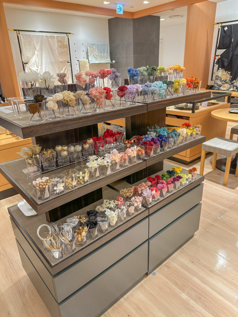 実際のブースでは、色鮮やかなフラワーアクセサリーが並び、多くの方が足を止めてご覧くださいました。特に、成人式や卒業式用の髪飾りをお探しのお客様が多く、商品の質感や色味を直接手に取って確認できる点が好評でした。